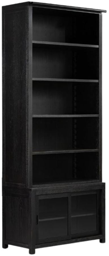 Stately and storage-driven. Inspired by traditional library design, an oak bookcase is finished in a worn black for a vintage European vibe. Glass doors slide open to reveal even more storage.Read More