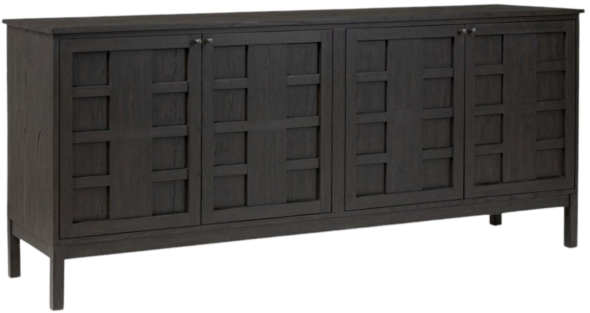 A smoked black finish plays up natural wood grain, while grid-like patterned doors bring dimension to clean lines. Interior shelving awaits storage of serveware, table linens and more. This piece is made to be both gorgeous and sturdy. Make a bold statement by incorporating this furniture into your home.Read More