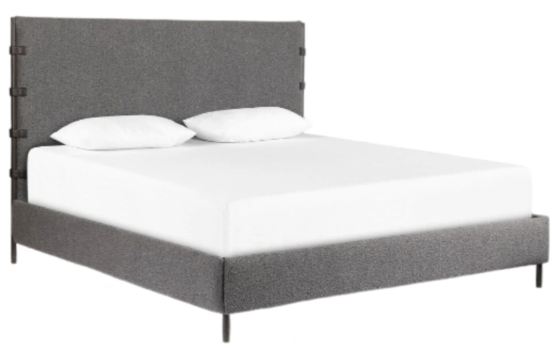 Bring texture into play. Upholstered in a classic cream-colored boucle, with decorative faux leather straps for cool contrast. Standard box spring required. Its quality craftsmanship make it a versatile addition to any bedroom, ensuring restful nights and elegant decor.Read More