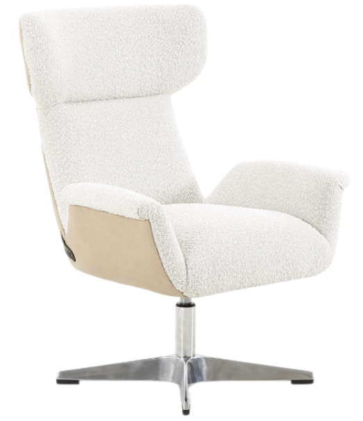 Turn up the drama. A strikingly sculpted wing chair mixes materials to modern effect, with boucle upholstered seating cradled by top-grain leather. All atop an adjustable pewter-polished aluminum base. Its comfortable cushioning and durable construction provide excellent support for extended periods of sitting, making it a practical choice.Read More