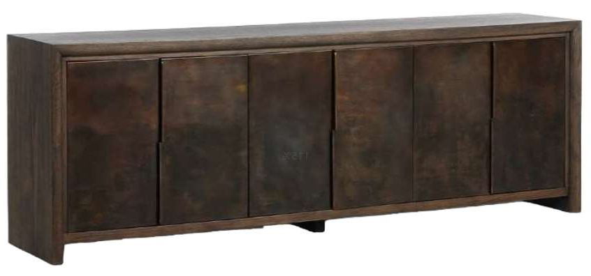 Espresso-finished oak casing pairs with six coffee-colored iron door fronts, for an intriguing material mix. With bullnose waterfall framing and offset metal hardware, this spacious sideboard offers an elevated industrial look. Three rear cutouts for cord management.Read More