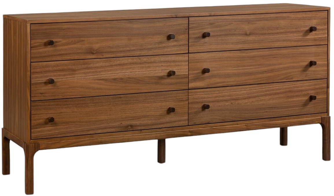 Inspired by campaign-style furniture of the 1800s — packable pieces first designed for traveling military use — a simply shaped dresser of natural walnut features a subtly inset top and rounded legs, finished with wooden hardware. This item has been modified to comply with the STURDY Act.Read More