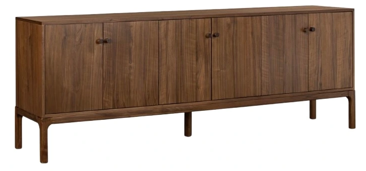 Inspired by campaign-style furniture of the 1800s — packable pieces first designed for traveling military use — a simply shaped sideboard of natural walnut features a subtly inset top and rounded legs, finished with wooden hardware.Read More