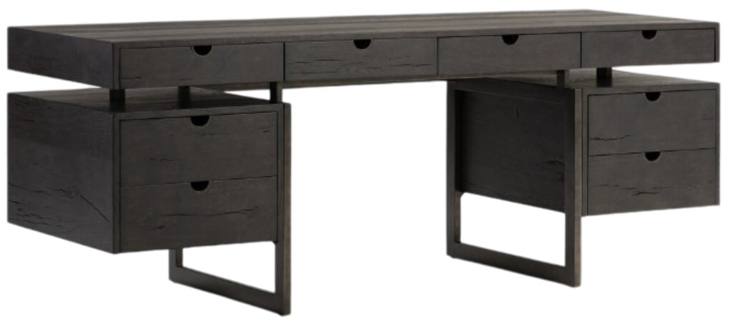 Timeless materials meet contemporary shaping. Made from solid reclaimed French oak and finished in a deep espresso, this executive-style desk features eight drawers for maximum storage space. Finished front allows for float-styling in a room. Steel legs and drawer pulls with a soft-close function.Read More