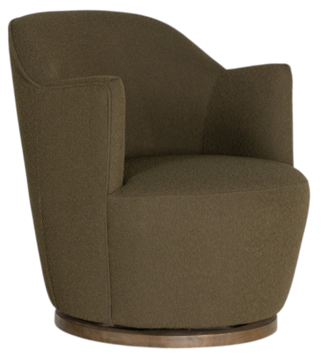 Intriguing while inviting. Drum-style seating is upholstered in a soothing and textural olive boucle. A swivel base of distressed natural parawood places a fresh spin on a feminine form. Easy to clean and made from fully recyclable materials, Fiqa fabrics are machine-washable, stain-resistant, water-repellent and antimicrobial.Read More