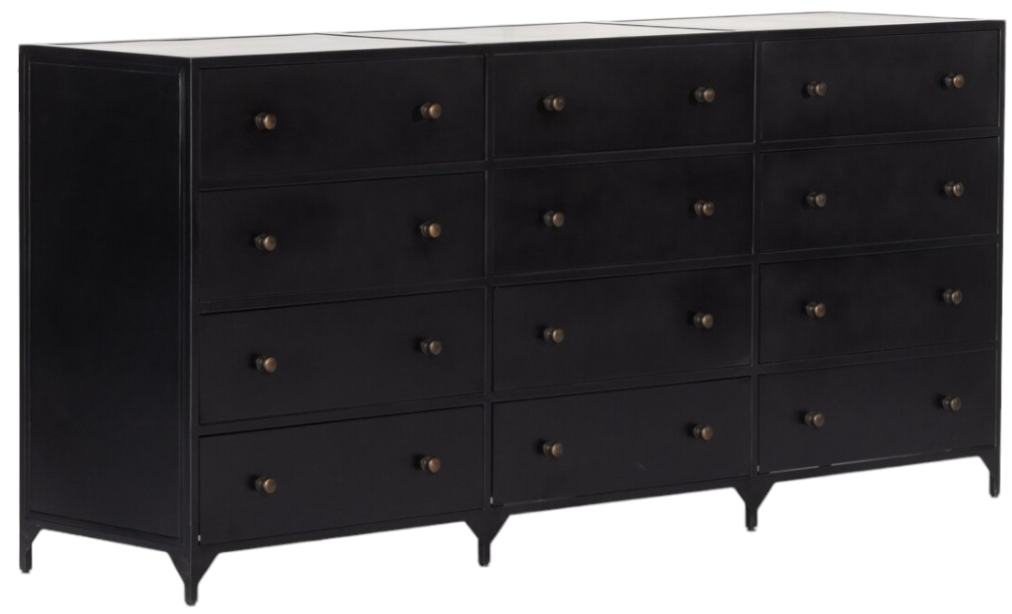 Industrial-inspired, black-finished iron forms a wide and roomy twelve-drawer dresser, with bronzed knobs for contrast. This item has been modified to comply with the STURDY Act. See a full list of modified products and data changes in the “STURDY Act” file in the Downloads section below.Read More
