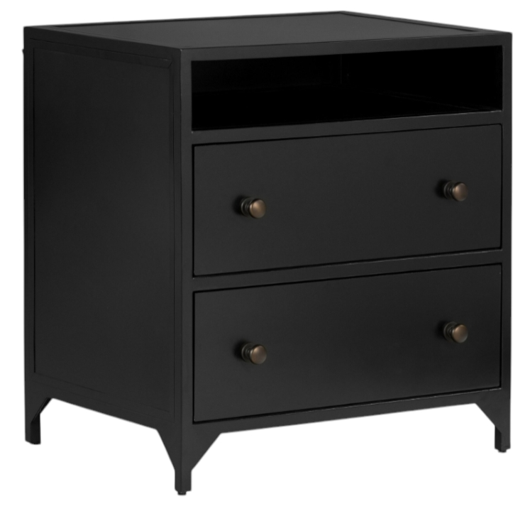 The Four Hands Belmont Black 2-Drawer Nightstand features a sleek, matte black finish with clean lines. Two spacious drawers, accented with subtle brass hardware, offer stylish and practical bedside storage.Read More