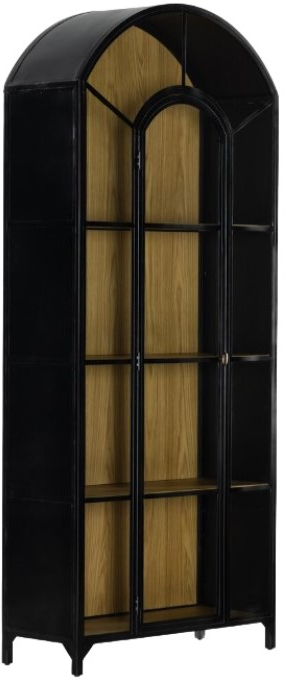 Display barware, books and keepsakes in beautifully arched cabinetry. Solid iron sheeting is finished in a soft, matte black with contrasting brass hardware. Glass fronts allow back paneling of light oak veneer to show, for an eye-catching contrast of color.Read More