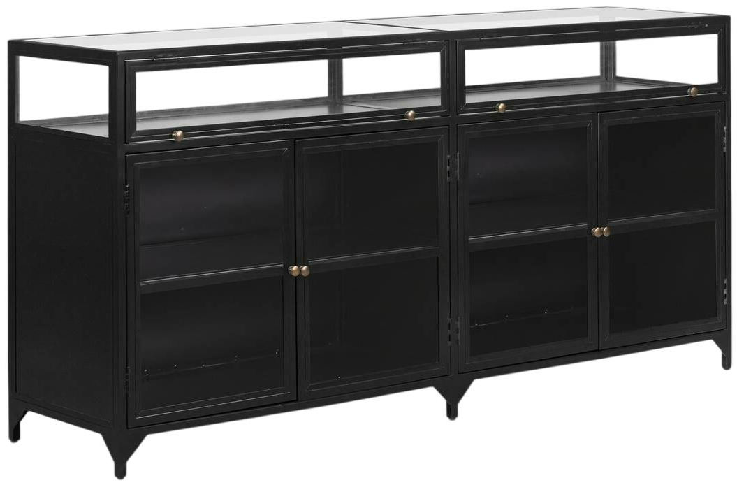 A shadowbox-inspired sideboard by Four Hands gives your inner collector a place to play. Store prized possessions behind clear glass fronts, with black-finished metal casing and brass hardware for contrast.Read More