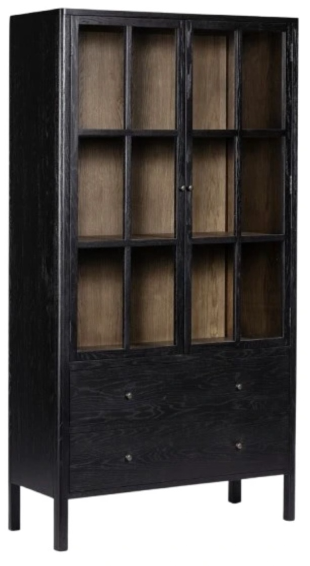 A completely transitional piece, this two-toned cabinet features a blend of understated modern design with a hint of heritage detailing. Crafted from solid oak and oak veneer with a brushed ebony oak exterior and tan oak interior. Built with a variety of storage options and finished with iron hardware and large tempered glass cabinet doors.Read More