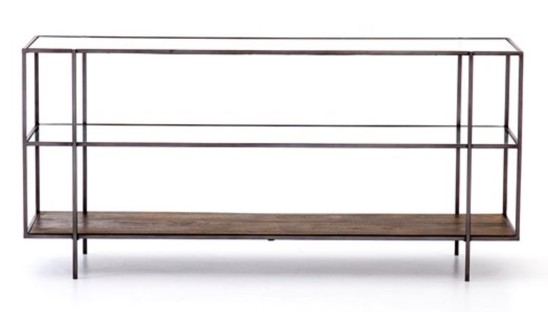 Mixed materials refashion simple design into something beautiful. Slim, Parsons-style iron framing supports three-tiered shelving of brown mango wood and clear tempered glass.Read More