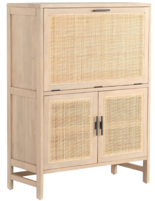 Monochromatic with a textural twist. Natural mango frames woven cane fronts, with gunmetal-finished iron hardware. A drop-down front opens to a 30" height, revealing spacious shelving for storage of stemware, bottles and barware.Read More