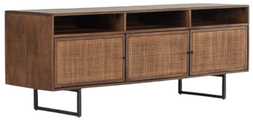 It's surrounded by solid mango casing, and brown cane door fronts place a textural twist on midcentury-inspired styling. Airy and angular, charcoal-finished iron legs bring just-right balance to the whole look.Read More