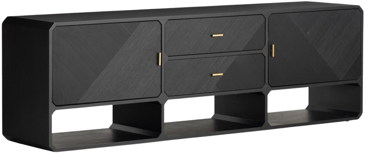 Channeling inspiration from the Seventies, a media console of black ash adopts petite reeding for a linear look, with chamfered edging and an extended base for an open look with bonus storage.Read More
