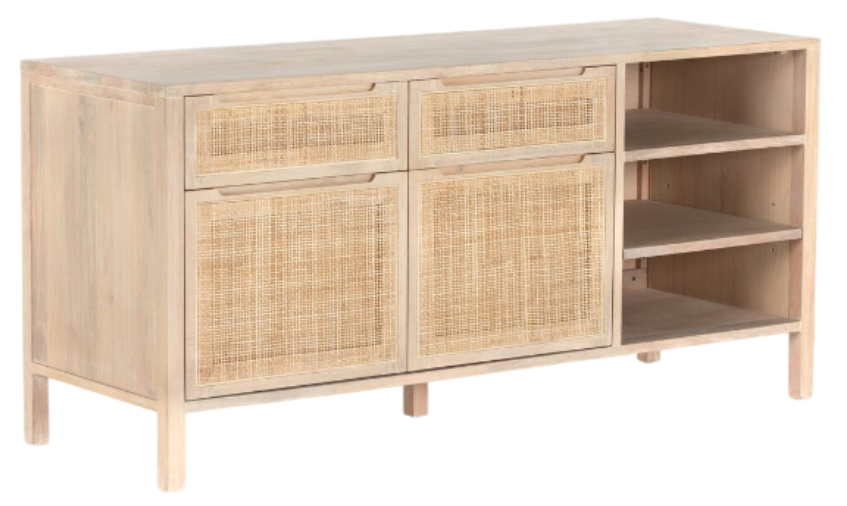 Mid century-spirited while beautifully on trend. A clean-lined filing credenza of white-washed mango features natural cane-covered drawer fronts plus open shelving, bringing storage, contrast and texture to the modern office. Style solo or pair with matching desk and/or filing cabinet.Read More