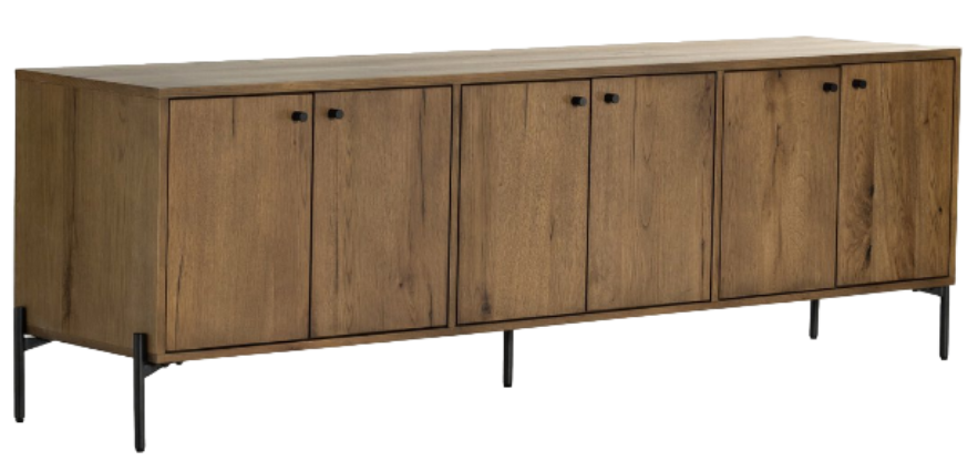 Framed by slim iron finished in a dark gunmetal, amber oak and contrasting resin form a modern media console. Perfect for holding drinks or displaying decor while adding a touch of elegance..Read More