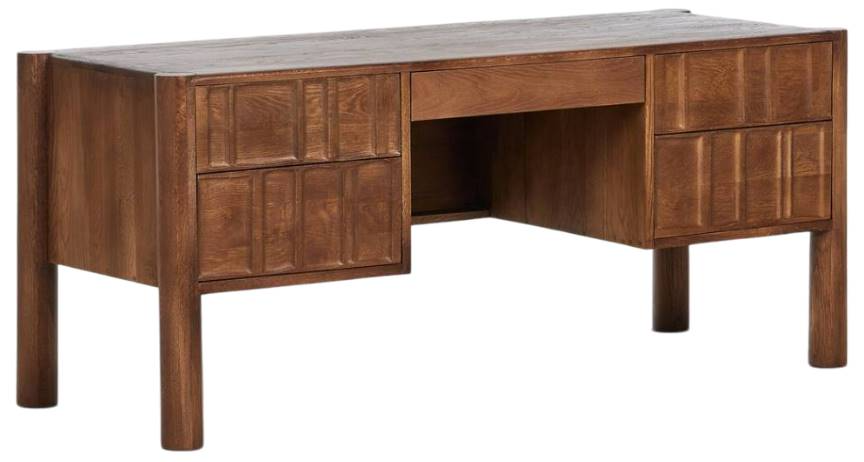 Grain and character variation within a solid oak finish give this desk organic visual interest. Full-width carved panel on opposite sides add depth, while a sleek pencil drawer for easy storage. Floor-to-top cylinder legs give a primitive look that balances the movement of the wood pattern.Read More