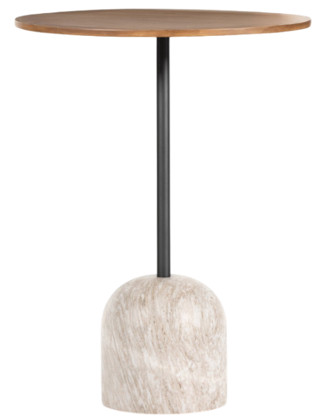 With modernized Art Deco vibes, a weighted base of white antique marble supports slim iron posting topped by a rounded, overscale bar top of natural oak. Its stylish appearance and sturdy build make it a perfect centerpiece for modern dining spaces, combining both functionality and elegance.Read More