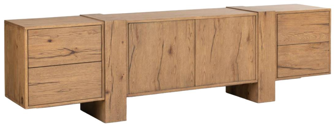 Crafted from a mix of solid oak and thick oak veneer, the contemporary shaping of this grand-scale media console lets the natural graining, cracking and character of the woods take center stage. Designed with oversized legs and cantilevered doors, with push latch doors.Read More