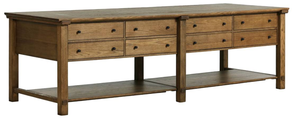 Make room for more prepping, gathering and storage. This large and functional kitchen island features eight wide drawers on one side, a large bottom shelf below and room for stools.Read More