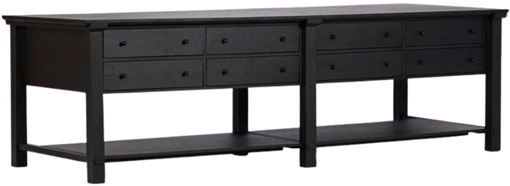 Make room for more prepping, gathering and storing. This large, functional kitchen island features eight wide drawers on one side, a large bottom shelf below and room for stools. Designed with an oak cradle frame that holds the tabletop above with exposed joint details on the shelf and legs below.Read More