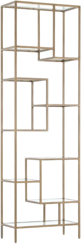Staggered shelves play across a slim and simple antique brass-finished iron framework.
