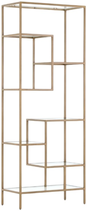 Staggered shelves play across a slim and simple antique brass-finished iron framework.