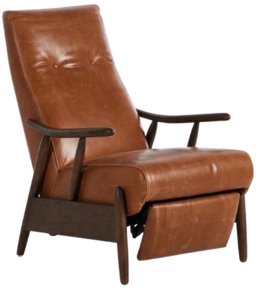 A mix of midcentury and Japanese antique inspiration. The recliner's exposed solid wood frame is flanked by paddle arms that curve into a high back accented with two button tufts. Upholstered in a rich tobacco-hued leather produced at a family-owned tannery in Thailand.Read More