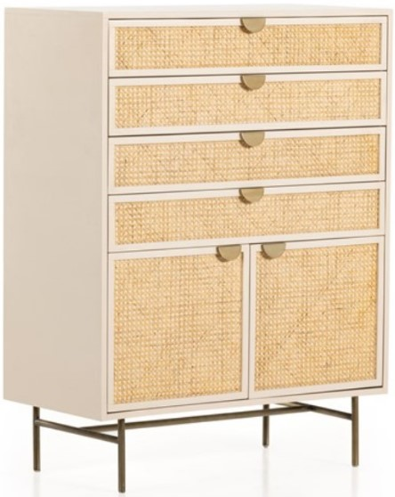 Complete your bedroom design with this dresser from Four Hands. Bring a light look to bedroom styling. A tall, lacquered dresser features woven cane panels and half-moon hardware finished in an aged brass. Four drawers plus cabinetry with interior shelving for generous storage space.Read More