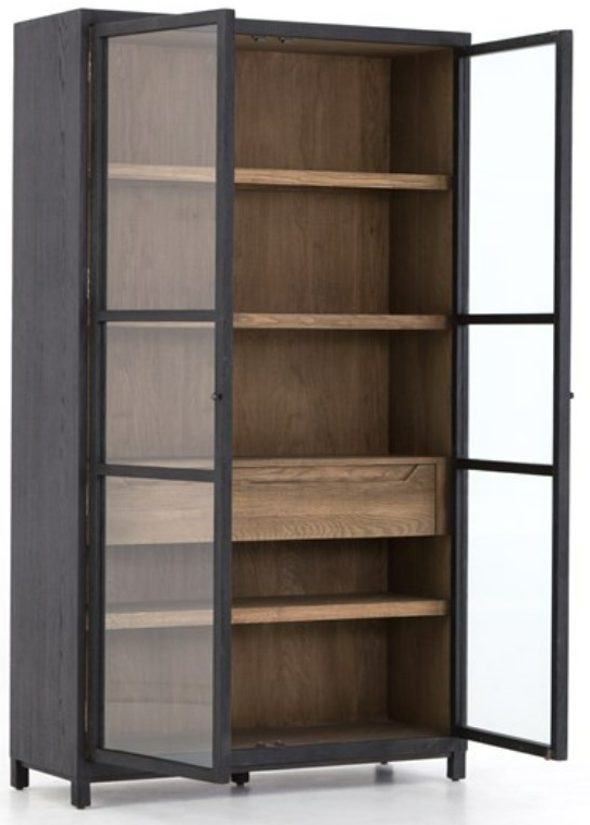 Two-tone transparency. Black drifted oak frames lighter interior shelving for subtle but striking contrast. Glass doors allow for prized possessions to dazzle on full display while a spacious interior drawer adds an out-of-view storage option.Read More