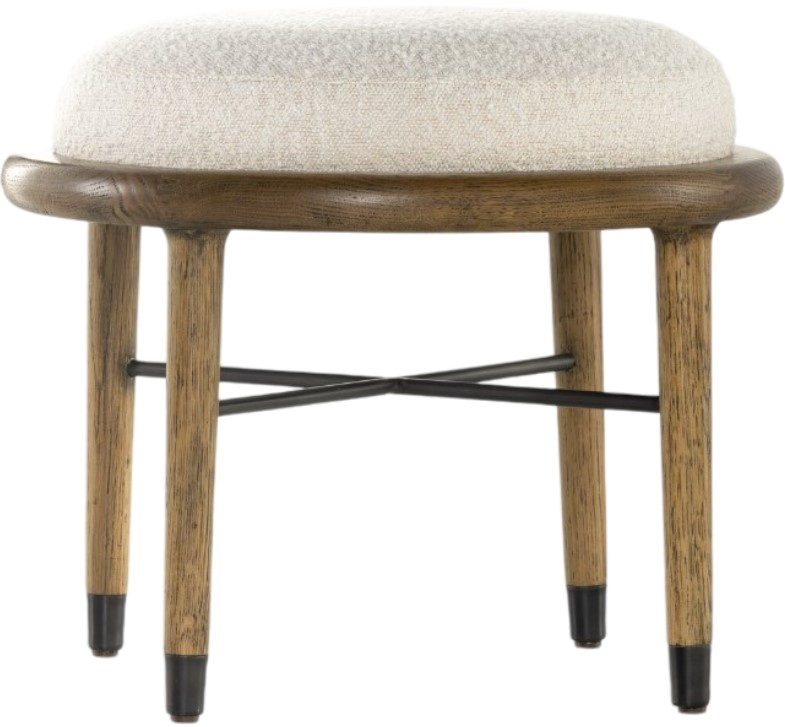 Vintage gone modern. Solid oak forms a finely sculpted frame for textural boucle upholstery in a beautifully rich cream. Gunmetal-finished iron stretcher and ferrule caps for a fresh finishing touch. Makes for an easy extra seat or surface in any room.Read More
