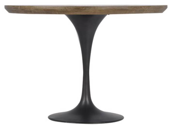 Mixed materials make the table. Classic tulip shaping is recast with a deep black cast-iron base and a patchwork brass-clad top banded in distressed oak. Bistro sizing perfect for a cozy breakfast nook.Read More