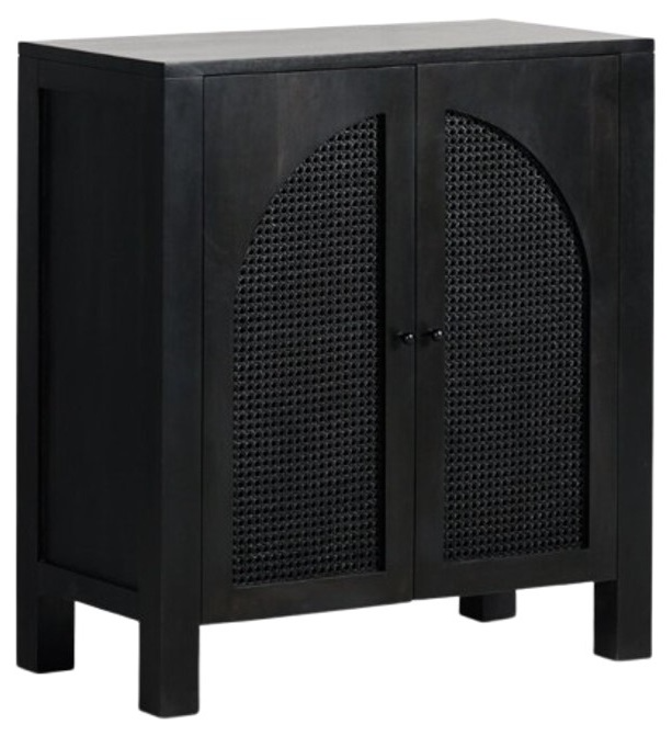 Small in scale, big on presence. Black-washed mango encases arched cane door panels featuring black-finished iron hardware, for a monochromatic, material-driven look. It features ample storage with adjustable shelves, a wine rack, and dedicated spaces for glassware, making it ideal for entertaining and organizing.Read More