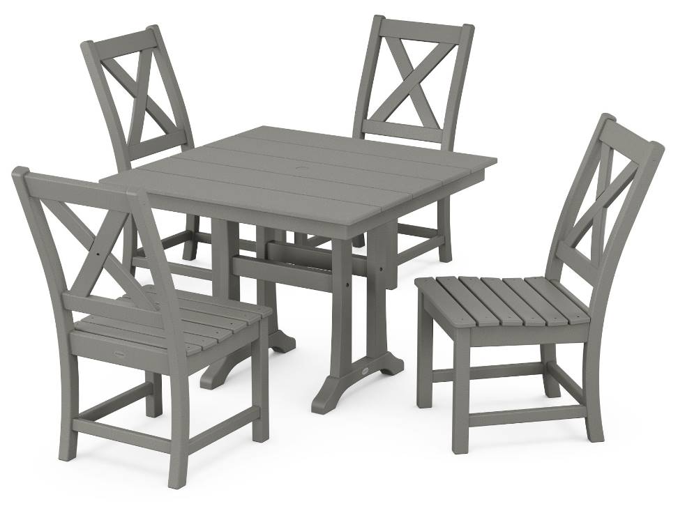 Set an inviting dinner scene for family and friends with our Braxton Side Chair 5-Piece Farmhouse Dining Set With Trestle Legs, shown here with four side chairs sitting pretty around a square dining table.