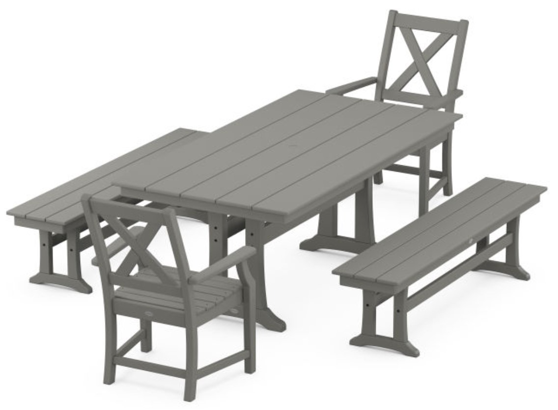 A blend of modern design and rustic elements, the Braxton Collection is always a conversation starter. Set an inviting dinner scene for family and friends with our Braxton 5-Piece Farmhouse Dining Set With Trestle Legs, shown here with two armchairs and two benches sitting pretty around a rectangle dining table.Read More
