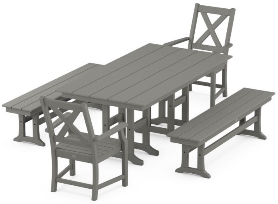Includes (2) Braxton Dining Arm Chairs, (2) Farmhouse Trestle 65" Benches, and (1) Farmhouse 37" x 72" Dining Table