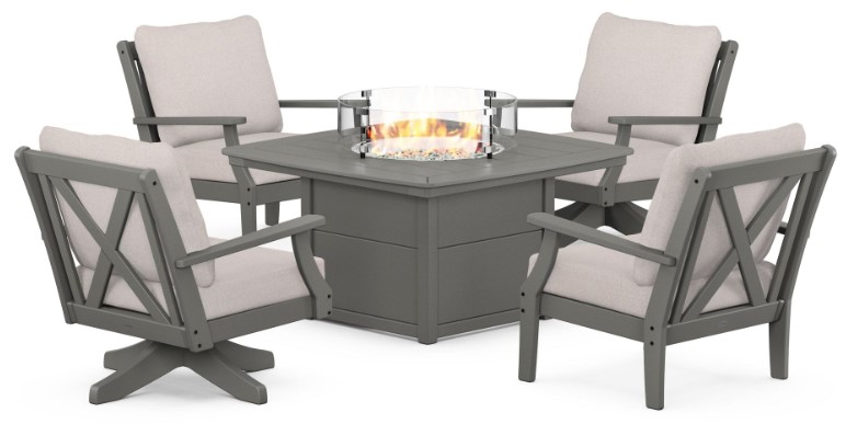 You can three others can snuggle up on a cool evening on the Braxton 5-Piece Deep Seating Swivel Conversation Set with Fire Pit Table. Choose to have freedom of movement in the soft and comfortable Braxton Deep Seating Swivel Chairs or stay blissfully still in the relaxing and stylish Braxton Deep Seating Chairs. You won't feel a bit of the cold thanks to the warmth emanating from the chic Nautical 42" Fire Pit Table.Read More
