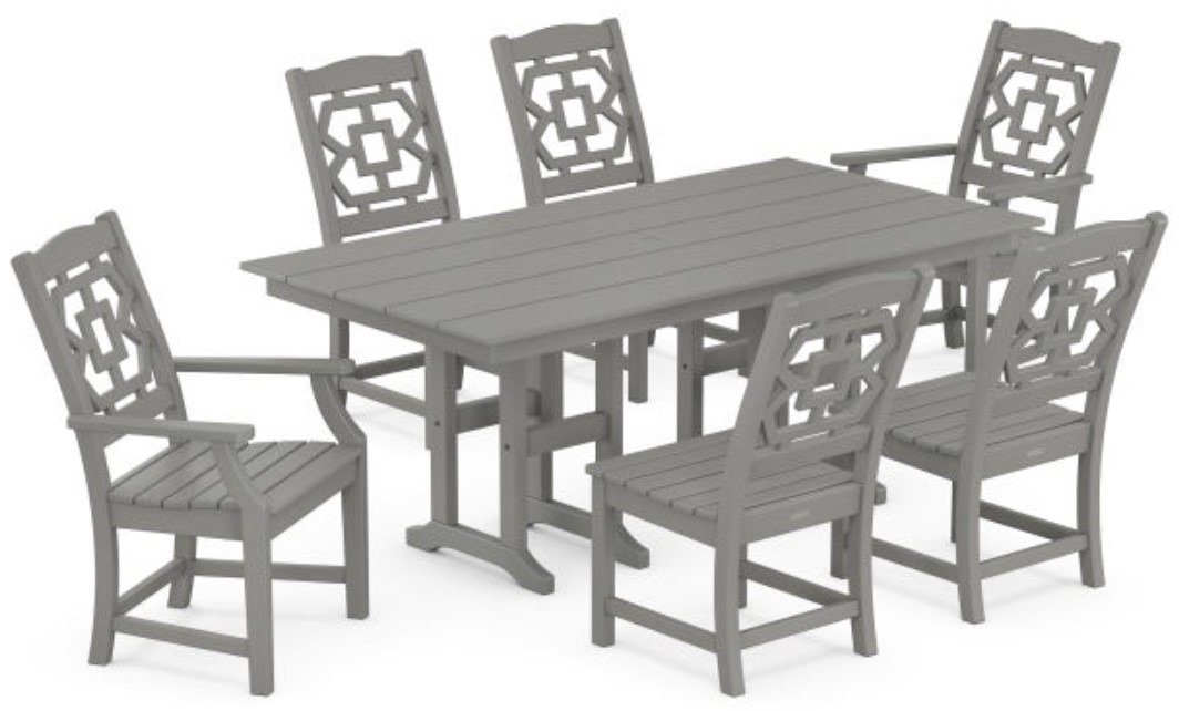 Set includes (4) Chinoiserie Dining Side Chairs, (2) Chinoiserie Dining Arm Chairs, and (1) Farmhouse 37" x 72" Dining Table