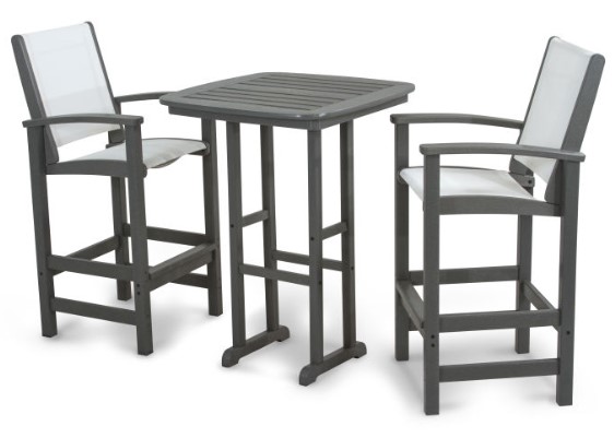 Modern design and laid-back comfort reach new heights with the POLYWOOD® Coastal 3-Piece Bar Set. Ideal for smaller outdoor spaces, this bar-height set is just the right size for an intimate dinner or drinks with someone special. Choose from a variety of attractive, fade-resistant lumber colors constructed with genuine POLYWOOD lumber that provides the look of painted wood without the maintenance of natural wood. The durable sling fabric is not only comfortable, but it dries quickly and resists tearing, fading, and mildew.Read More