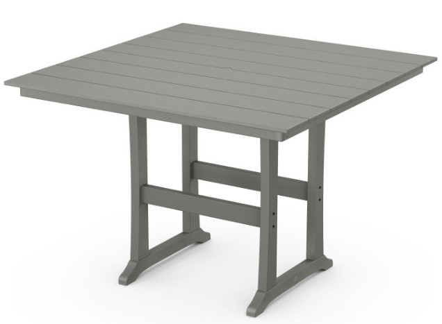 Add height and function to your outdoor patio or porch with the Farmhouse Trestle 59" Bar Table. Seat up to eight guests for drinks, appetizers, or game night on a sleek table top and plenty of leg room underneath. To complete the look, choose from a variety of POLYWOOD bar chairs; this classic bar table pairs well with many different chair designs.Read More