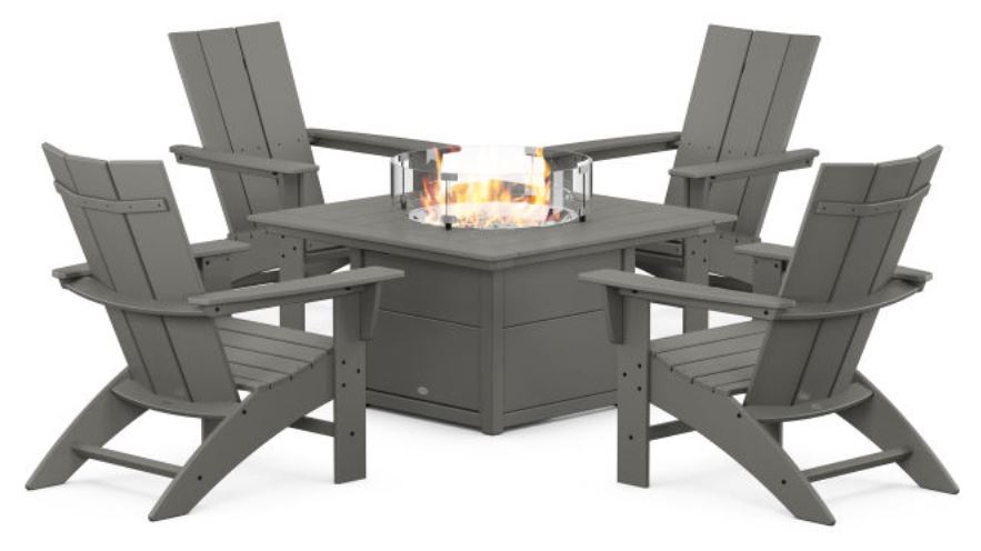 Includes (4) Modern Curveback Adirondack Chairs, (1) Square 42" Fire Pit Table, and (1) Fire Pit Table Cover
