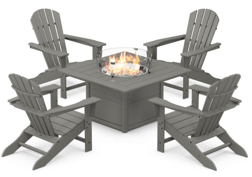 Includes (5) Palm Coast Adirondacks, (1) Square 42" Fire Pit Table, and (1) Fire Pit Table Cover