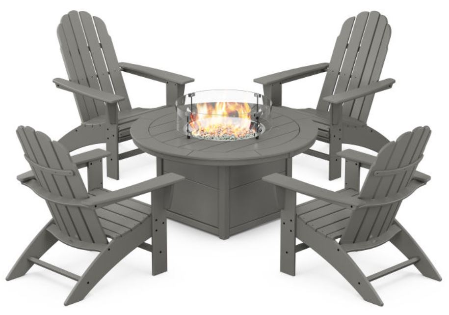 Includes (4) Vineyard Curveback Adirondack Chairs, (1) Round 48" Fire Pit Table, and (1) Fire Pit Table Cover