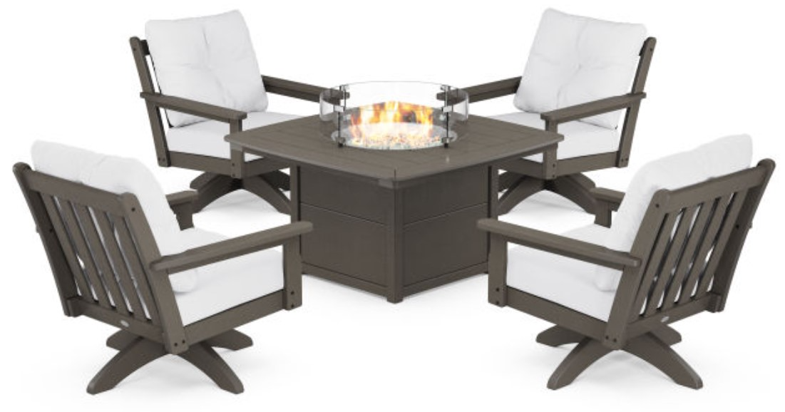 Includes (4) Vineyard Deep Seating Swivel Chairs, (1) Nautical 42" Fire Pit Table, and (1) Fire Pit Table Cover