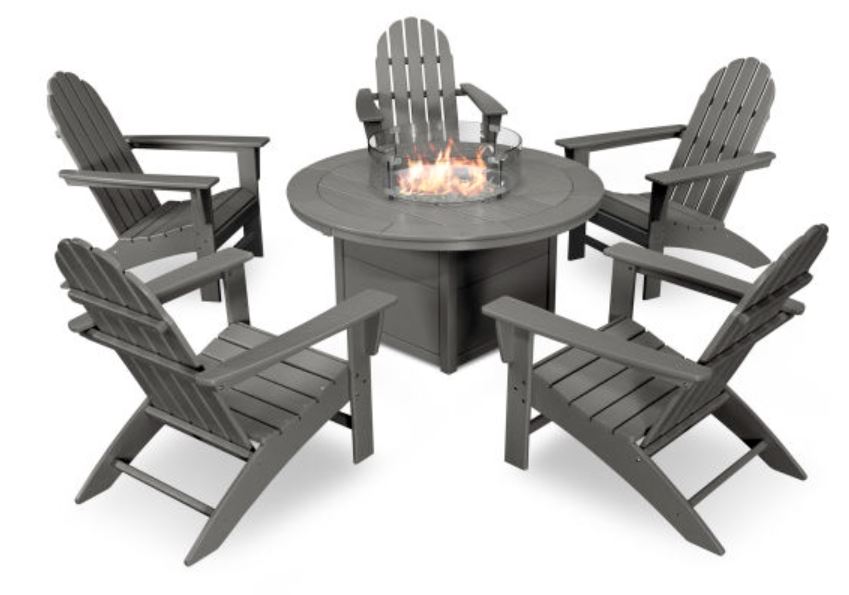 Includes (5) Vineyard Adirondack Chairs, (1) Round 48" Fire Pit Table, and (1) Fire Pit Table Cover